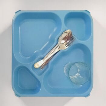 Ελαφρύς, ανθεκτικός και στοιβαζόμενος δίσκος / καπάκι 5 θέσεων από πολυκαρβονικό χωρίς BPA, διαστάσεις 330 × 330 × 35 mm, βάρος 485 g, αντοχή θερμοκρασίας -40 °C έως 100 °C, δύο μεγάλες και δύο μικρές θήκες τροφίμων συν κεντρική υποδοχή μαχαιροπίρουνων, ιδανικός για επαγγελματικούς και εκπαιδευτικούς χώρους.