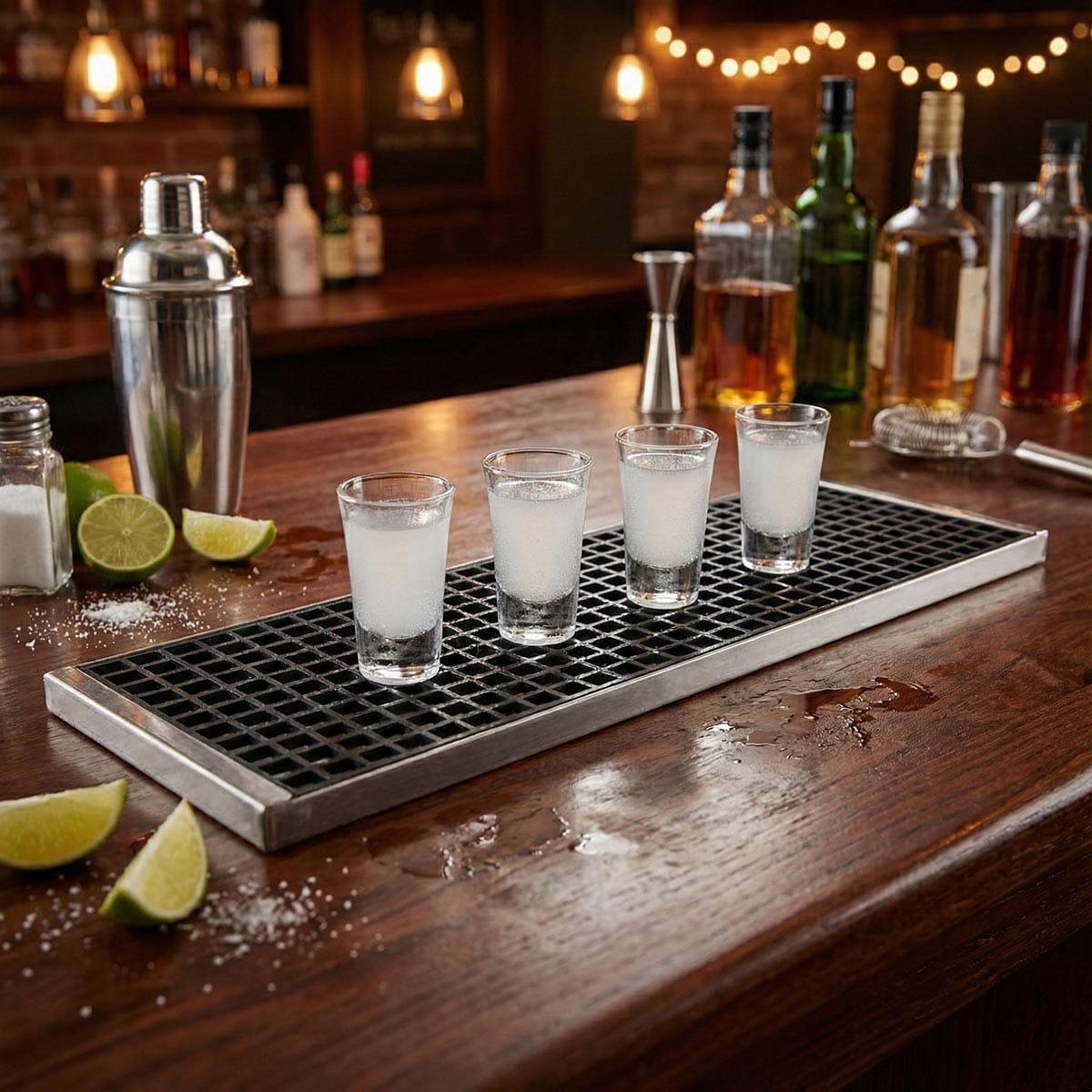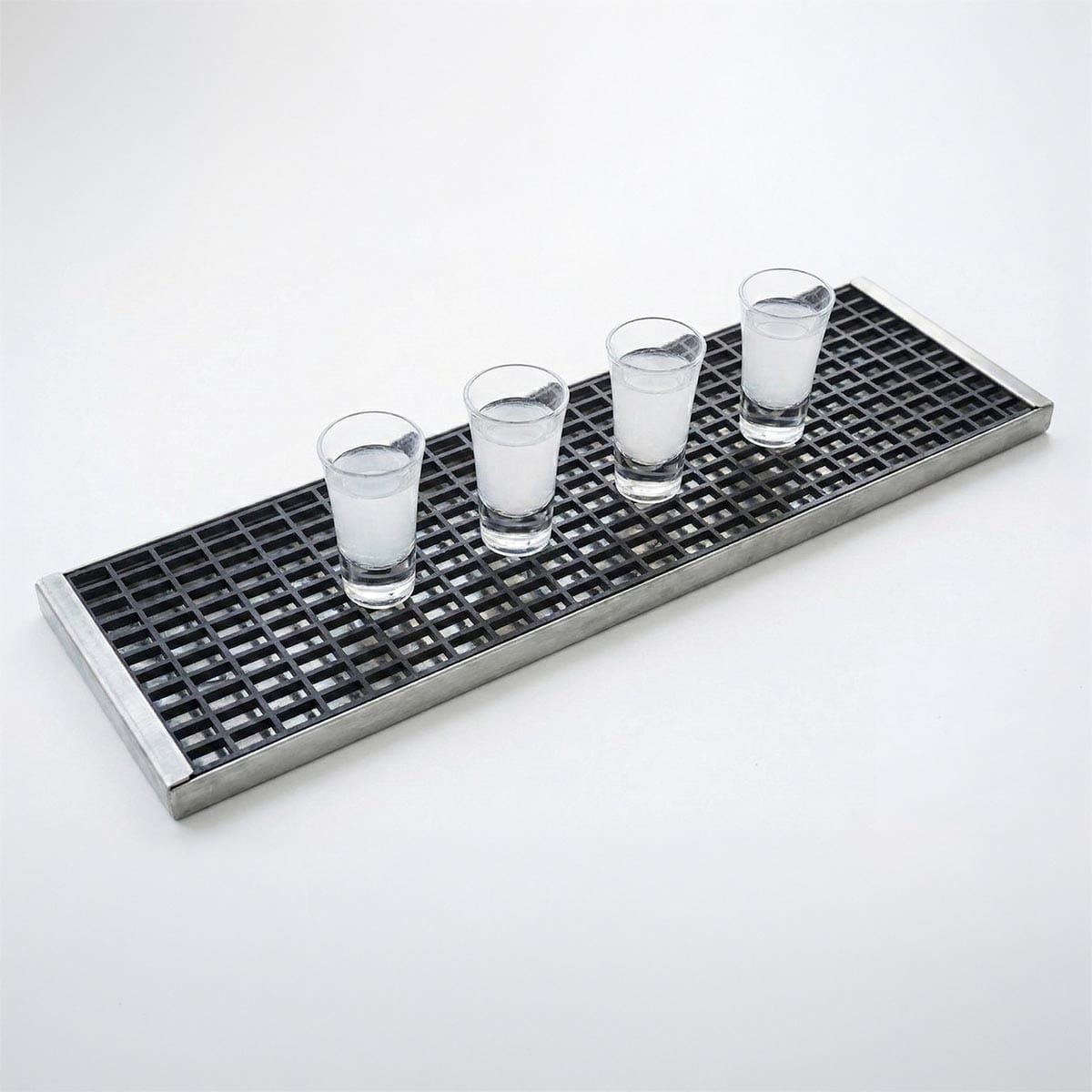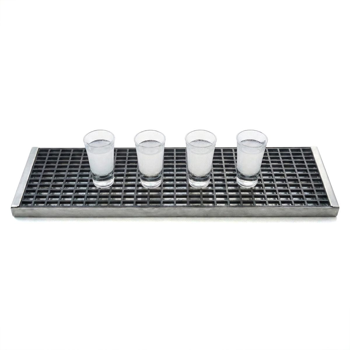 Service Mat INOX 35 × 27 εκ. με σκελετό ανοξείδωτου 304 και αφαιρούμενο πλέγμα PP· στραγγίζει άμεσα τα υγρά, αποτρέπει ολισθήσεις και χαρίζει premium look στον πάγκο—must-have για επαγγελματικά μπαρ.
