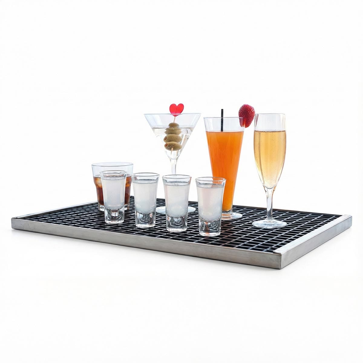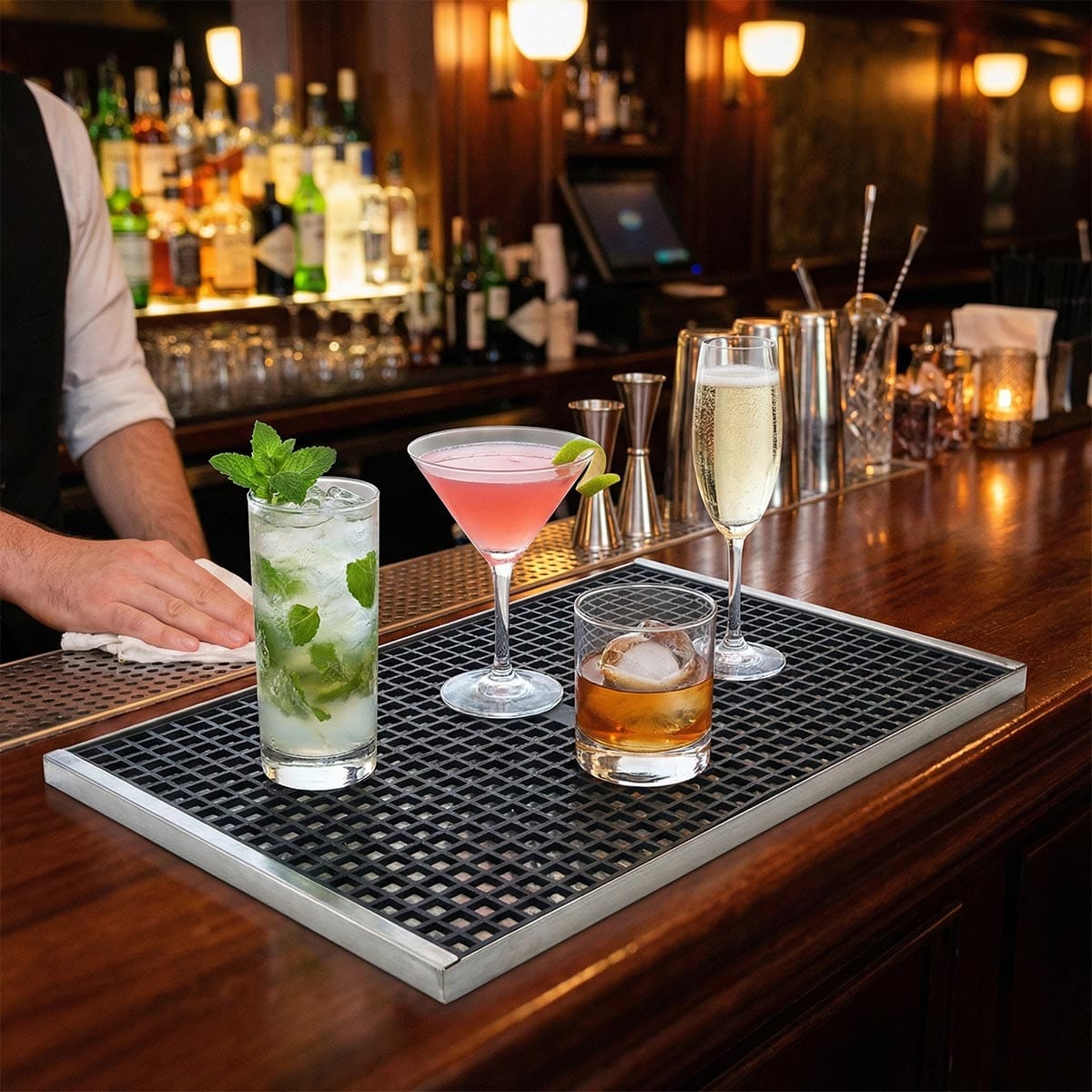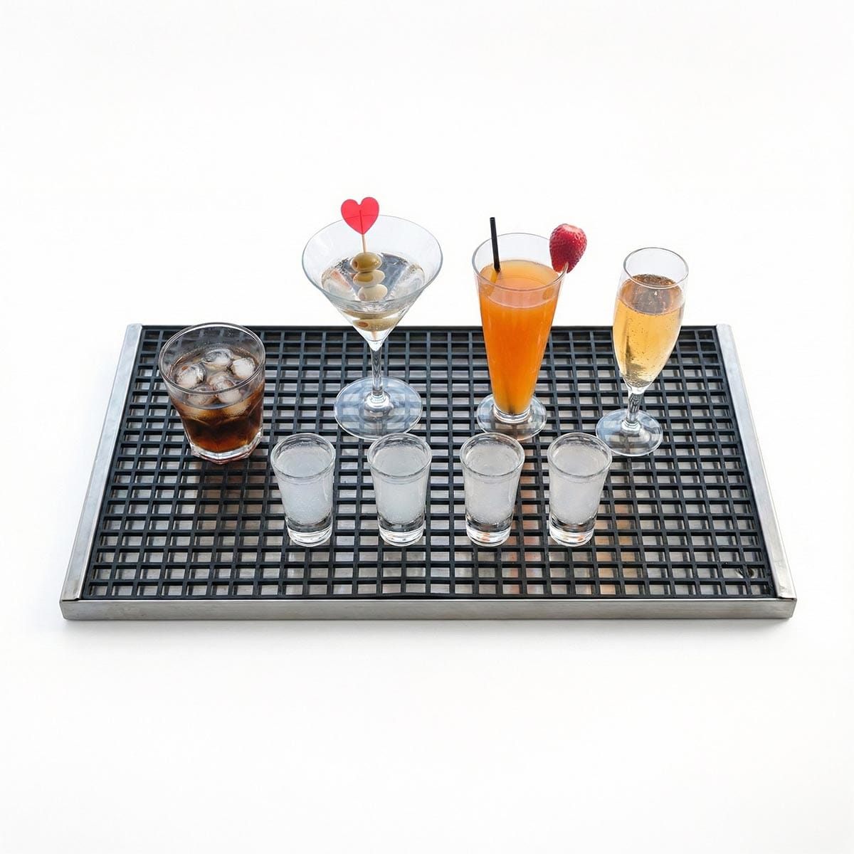 Service Mat INOX 35 × 27 εκ. με σκελετό ανοξείδωτου 304 και αφαιρούμενο πλέγμα PP· στραγγίζει άμεσα τα υγρά, αποτρέπει ολισθήσεις και χαρίζει premium look στον πάγκο—must-have για επαγγελματικά μπαρ.